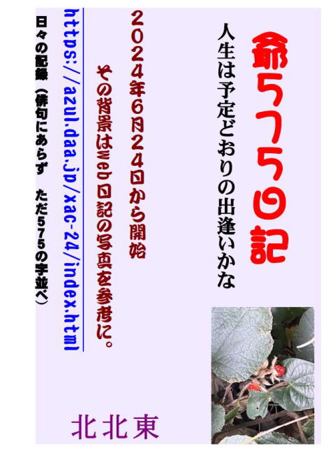 | 3 | 北北東 | <575で一日を記録する方法>何気なく過ぎてゆく一日、その中で何が一番の関心事なのか指折り文字を数えて書き残してみようとふと思ったのが、6月24日だった。・・その後ずっと続けてみたが、川柳でもない、駄洒落も多いただの「爺575日記」です。 左のWEB冊子の表紙をクリックするとダウンロード(PDF版)出来ます |