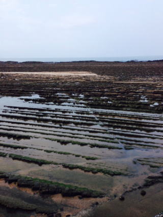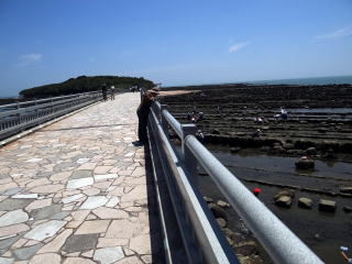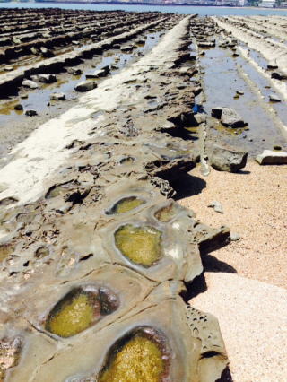 鬼の洗濯岩は「隆起海床と奇形波蝕痕」と呼ばれるらしい。青島周辺いたるところにある。この形状、近くで見るとゴツゴツしていた幅広くホントに鬼が洗濯したら着物はズタズタに破れそう。引いた水たまりには小さな魚がいるようだ。子ども達が網を持って探していた。