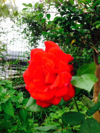 赤い薔薇の花: 風が強く一時もジッとしていない。花びらは揺れるばかりだ。iphoneのピントが定まらない