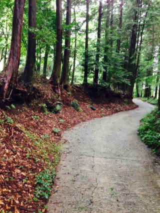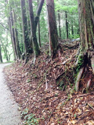 地震前後で変わったのは人工物だけ。 壊れそうな雰囲気の山小屋までの小径の低い連続した土壁はまったく変化なし。結構丈夫だ。周囲は緑が濃くなってきた。