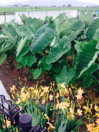(左)里芋の葉、こびとが雨の日にさす傘:雨が銀色の粒となる。:散歩途上の他人の畑から