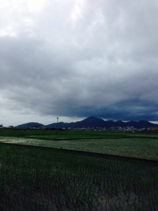 <写真>:午後4時の我が窓から南区田んぼの風景。雨雲が西から攻めてきそうだ。