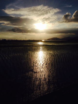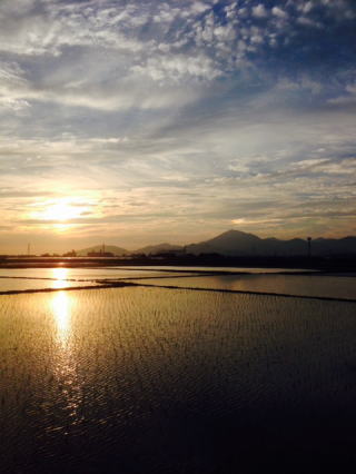 写真: 散歩の写真だが今日は金峰山にももう一つ夕陽が見えた。2つの夕陽が田植えを待つ田んぼを照らしていた。