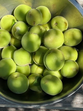 | 2022/05/18水 | 色々な反省で寝不足のけだるい朝。気分転換に庭の梅ちぎりをした。結構大きくなってきた。まだまだ大きくなりそうだけど、この辺で手を打つか。だって口に入らないほど大きくなったら困るから・・梅酒にしたあと、この大粒の梅を口いっぱい頬張り少し酔っていい気分になれるのは・・まあこのくらいの大きさまでというわけ。我が家の狭い庭に二本の梅の木があって、もう一本は小粒なので、こちらは梅干し要員としよう。梅酒要員も数が少ないので買い足して1年分の梅酒に。梅の木は意外に棘が多い。幹に登るとポケットに棘が刺さって前進を阻む。今日のこの時のための予防線なのかも。 |