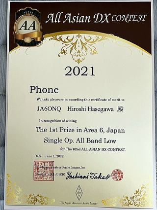 <趣味>昨年9月に参加したAll Asian DX contestの賞状が届いた。これでこのコンテストは3回目かな。マルチバンドシングルオペレータで100Wまでの部門だから、少人数の参加者がログを出せば貰える難易度の低い九州で1番という賞だ。このコンテストはシグナルレポートに自身の年齢をつけて交換するので面白い。私より年齢が高い人が少ない。アジアの国は20代、30代の若い人が多いのに比べ、ヨーロッパや日本は高齢者ばかりが多い。私のような暇人が多く参加しているのかな。このコンテストで交換した最高年齢は79歳のフィンランドの方で最低は北京の9歳の子。今年も楽しみだ。台風が来た年もあって参加を断念、今年も天候が味方してくれますように!今から祈っているところだ。 |