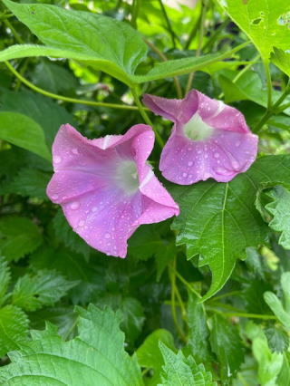 2021/08/18水    昼前に朝顔の顔を観に小雨の中を庭に出た。今年も朝顔の季節も終わるね。なんて思いながら鬱陶しい雲を背景に入れようかと迷ったが、花だけに焦点をあてた。花びらに水玉があって、異常繁殖の大葉の茂みでひっそりとしている。ピンクが青い葉の中で目立っていた。今日は予定はない。昼からはゴロンゴロンとのんびりしよう、今日も散歩は無理。家の中でウジウジしていよう。室温27度で半袖も寒く感じる。雨が早く止んで青空が出ないかな。植物も人間もギラギラの太陽が待ち遠しい。   仮想敵君のワンちゃんを抱っこしての昼寝。そっとカメラを向けた積もりが元野良猫ハナの目が開く。