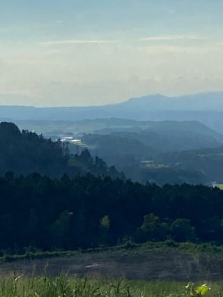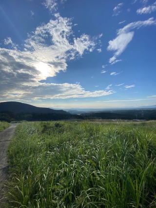 2021/08/20金    久しぶりの裏山散策。やはり夏は青空でなければ・・雨上がりなので長靴を履いて出かけた。午後5時頃の散歩時間は爽やかな空と風。8月もやがて終わる、折角の時間だ。家に閉じこもるわけにはいかない。一人も会わずに散歩出来る裏山は大好きだ。山の向こうに空港の滑走路がギリギリ見えるか見えないかのところにある。もう少し上に登ればと思うが、この草原は大切畑ダムの土砂堆積仮置き場に変身中、盛土の現場だ、4年間溜められる。だから先へ進めない。今日の歩きは6464歩、久しぶりの6千歩越え。歩きの終わりは我が裏山のニッケの木の葉っぱを口に咥えて、疲労回復。明日からは再び曇りと雨の予報だ。   今日は猫のハナは山小屋へ来るときこっそり隠遁の術を使って、人間の予定時間を狂わせてきたが、出るときまでじっと追跡。車に荷物運びするとくにお縄頂戴で、大人しくして貰った。