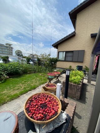 2021/08/23月   久々のまあまあの天気、梅干しの名の通り梅を干している。梅を漬ける前に外で青梅を干したとき近所の病院で何の前触れもなく除草剤を蒔かれたものだから大慌てしたが・・その後電話で連絡が来るようになった。今日は左右上下確認しての梅干日となった。