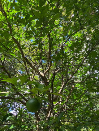 森の光が当たらない場所にある小みかんの木に小さな青い実が6個、困難に負けずに落ちずに頑張っている。12月まで頑張ると正月の飾り餅の上に載せることが出来る。天候不順だから、ちゃんと育つかが一番心配。檸檬の木は一つも実が付かなかったので、こちらは優秀だ。今日も雲が厚くて雨が今にも降りそうな天気だが雨は落ちてこない。