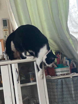 2021/09/08水   朝方雷が鳴っていて、今日一日雨なんだろうなあと思っていたら、全然雨も降らず、晴れてきた。天気予報も当てにならず。一日ぼんやりと体を休めていた。夕刻草ボウボウの田んぼ道を怖々と散歩した。田んぼの稲穂も随分充実してきた。ただ南方に台風14号があって、少々心配になる。自分で育てている訳ではないが、散歩道の稲穂が倒れるのを見るのは嫌だ。大回りで木部公園を周り5500歩になった。久しぶりの目標達成だ。猫は高いところが好きなくせに降りるのが苦手だ。  <趣味>
