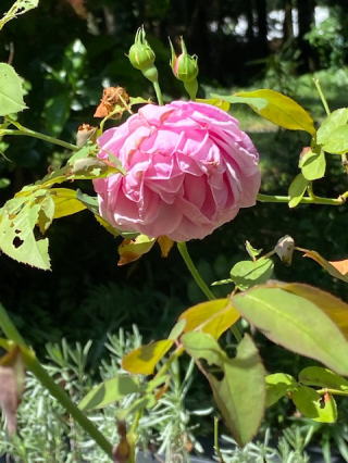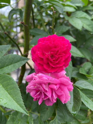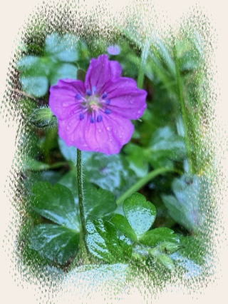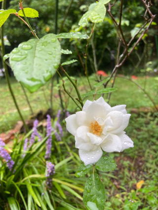 昨日のピンクの十二単の薔薇は今朝は弾けて潔く散っていた。あっと言う間の展開にびっくりする。2つ残っていたまだ小さかった蕾が開いて赤く膨らみ中くらいに丸まっていた。これも明日には開いてさっと散る運命かな。ふと足下をみると雨に濡れた紫に近いピンクの小さな花が雑草の中から浮き出ていた。野草には違いないが、観るモノが居なくてもちゃんと立派に咲いている。