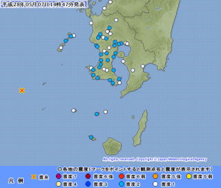 | 5月10日(火) | 今朝から芦北沖で3回揺れ水俣では震度3もあった様子、そんな訳で私はこの日車で南下することに躊躇していた。それでも娘の検診はちゃんと受けさせなければという思いもあって予定通りに出発した。<結果論だが偶然にも8時28分~13時41分までの間は揺れなしとは不思議。>その間に八代を往復した。午前9時30分出発し、途中小川のイオンモールで小便休憩(ここは一部食品館付近は開いていたが蔦屋など専門店は閉店している模様。周囲はブルーシート屋根多い)して娘の定期診察先の八代の産婦人科まで送った。そのあと2歳の孫を連れて八代ユメタウンへ。全く地震なんて関係ないというような場所で、普段通りの賑やかさで同じ被災地なのかと思うほどだ。もし揺れたら孫を守れるだろうかと大きな物の下敷きにならない場所ばかり選んで歩く。おもちゃ売り場を中心にキッズプレイルームで自動車遊びなどして待ち時間2時間ほどで診察が終わり、帰りは産科の近くの道路で娘を拾う。途上の竜北の道の駅に寄って昼飯を買う。その後熊本まで3号線をスイスイと戻り、買ってきた弁当を食べて、のんびりしている時に13時41分の揺れ(宇城市不知火の震度3=姉がいる場所)あった。それでまだ”揺れの非常事態中であること”を意識してしまう。 既に朝10時過ぎには宇城市に山沿いの地域で避難勧告が出され大雨が県下一円だとラジオは脅していた。夕方には雨は小降りになっており、土砂崩れなど起こらないことを願う。と書いてる16:12JSTも揺れがきた。西区で震度2だった。 |