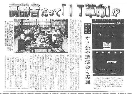 ![]() 高齢者だってIT革命 嘉島町の歩師奇屋がシニアの拠り所になったの は2000年8月1日のこと。それまで根なし草 で集まっていた仲間がやっと一同に集える場所が できました。2000年10月28日熊日夕刊1 0面にはここを会場にオフ会風景が楽しそうに報 告されています。 |