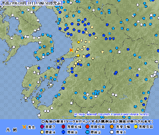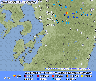 | 2016/9/4(日) | 朝から台風12号の影響で小雨時々曇り。孫は散歩に出ると言ってきかないが、久しぶりに爺さんは安息日。台風の遅すぎる足取りにイライラしている。その昔似たような台風が来たこともあったが、なかなか通過せず、ちょうど台風の中心になったとき東京まで飛行機で出かけたがその時も空の便に欠航もなく、スイスイと飛んで行ったときがある。8月か9月の社会 福祉士会の独立型研修で青年会館に行ったときだったかもしれない。ちょうどこんな具合でのろまな台風だった。我が家の猫の足がもっと速そうな気がする。雨さえ小降りのままであればそれほど心配はいらない。このHPを書いてるときゴーという音がした揺れたかな。17時50分・・・M2.4 西区で震度1という結果だ。地震が収まるのはいつのことだろう。 <地震> 本日は18時までに早朝の6:17八代中心に震度3、それと先ほどの揺れを含めて2つの震度1があった。風は大したことないが大雨が降ると危ないなあ。それから阿蘇で震度1。 図は八代の今朝の揺れ:八代市内直下が震源だ。 |