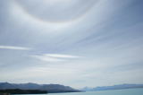 <ハロー現象>テカポ湖の水は綺麗なブルーその湖面の上空に現れた巨大な太陽周囲の円。当時、南極に近いからこんな現象があるのかと思っていたが、どうやら何処でも起こりそうだ。後光が差すという現象:当時私も現役だったが「たまにはのんびりしたい」と職場に無理にお願いして旅に出た。7年前だから当時55歳。その下でセルフタイマーでぱちり。見事、輪っかは外れていた。何の記念写真にもならなかった。↓
