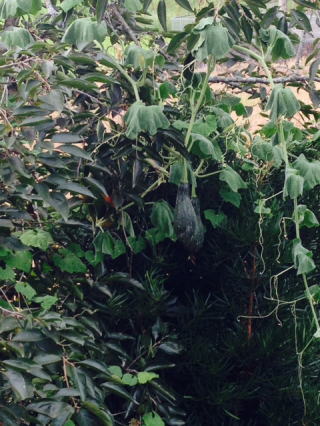 ![]() <写真>小川の柿の木にカボチャ(写真中央部分)がなっている。上の住宅の住民が育てたカボチャの蔓が我が家に侵入。取ってよいのやら悩むが柿の実は不作だったがカボチャが出来たので、まあよいか。 忙しいので、あんまり真剣にカボチャおられない。(^^;) <趣味> 3.5Mhzを2mHのCP6Sという小型のGPを調整のつもりでテスト、一発で徳島県の局とSSBで交信できた。3.535KHZだったのでデーター通信(JT65かな)と重なっており、早々に退散。こんなチビでもよく飛ぶと感心。(ただ7と14は使い物にならなかったが)21と28,50は調子よく飛ぶ。 <放射線> 20:00 0.09μSv/h 20:15 0.09μSv/h |