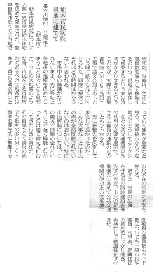 <熊本市民病院の行く末>朝は新聞を持ってトイレに入るのが習慣で、読んでいくうちに市民病院の診療科削減(困る障害を持つ小児の歯の治療。という内容で利用出来なくなることに不安を持っている方の取材記事があった)この話題にピッタリの読者の投稿が載っていた。それは私の送ったものだ。(リンク)(熊日8月22日号ひろば)そうなんだ。みんな声を上げなければどうするんだ。自身の元業種関連で・・市民病院に在職されている診療放射線技師が心配だ。多くの技師がいたのに、放射線棟には現在出入り不可という。高価なCT,MRI,血管撮影装置、マンモグラフィなど勿体ないことになっている。修理可能か?どうも・・利用出来ないみたいだ。今あるのは移動用CTだけという。 その昔、弱小病院から2名のマンモの研修をお願いしたことがあるが気軽に受け入れてくれた。患者さんの骨折なども直ぐに対応してくれ、心強い熊本市民病院だったのがあの4月16日を境に、その状況が一変した。いま職員はどうしているのだろう。経験が必要な職種もあって、診療が出来るまでの数年をどうして過ごすのだろうと心配である。 物事の決め方が有識者会議とあって、職員や通院している市民の声を一言も聞かないことがとても不満である。 職員を減らすと公然に言われており職員労組は首切り反対を闘う気はないのだろうか。内側も外側も一緒にやらないとどうしょうもない。 <趣味>今日も絵本を読んで聞かせたのでそれが読書かな。随分気楽にやってきたので孫の子守という意外な労役に戸惑ってしまっている爺だ。ああいつまで続くのだ・・・「仕事なら辞表が出せるのに」「娘に辞表が出せないのがツラい」 <放射線> 21:30 0.12μSv/h 21:45 0.12μSv/h |