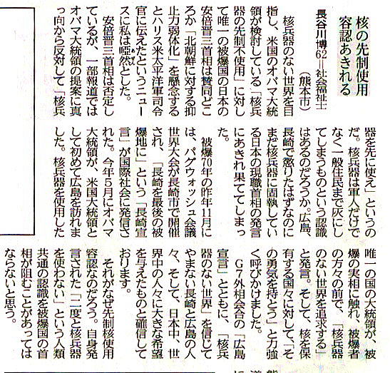 『核兵器の先制使用になぜ傾くのか安部首相』 核兵器のない世界を目指し、米国オバマ大統領が検討している「核兵器の先制不使用」に対して唯一の被爆国の日本の首相は賛同どころか「北朝鮮に対する抑止力弱体化」を懸念するとハリス米太平洋軍司令官に伝えたというニュースに私は唖然とした。オバマ大統領の提案に真っ向から反対して「核兵器を先に使え」というのだ。核兵器は軍人だけでなく一般住民まで灰にしてしまうものと言う認識はあるのだろうか。広島、長崎で懲りたはずなのにまだ核兵器に固執している日本の現職首相の発言にあきれ果ててしまった。 今年8月9日の長崎の原爆記念日に参列した首相は「被爆70年の昨年11月には、パグウォッシュ会議世界大会がここ長崎で開催され、「長崎を最後の被曝地に」という長崎宣言が国際社会に発信されました。本年5月、オバマ大統領が、米国大統領として初めて広島を訪れました。核兵器を使用した唯一の国の大統領が、被爆の実相に触れ、被爆者の方々の前で、核兵器のない世界を追求する、そして核を保有する国々に対して、その勇気を持とうと、力強く呼びかけました。G7外相会合の「広島宣言」とともに、「核兵器のない世界」を信じてやまない長崎及び広島の人々、そして、日本中、世界中の人々に大きな希望を与えたものと確信しております。71年前に広島及び長崎で起こった悲惨な経験を二度と繰り返させてはならない。そのための努力を絶え間なく積み重ねていくことは、今を生きる私たちの責任であります」と高らかに述べ、記録も残っている。それがなぜ先制核使用容認なのだろう。自身発言された「二度と核兵器を使わない」という人類共通の認識を被曝国の首相が阻むことがあってはならないと思う。 引用したはずの「」が消えているので不自然に"ですます体"が場違いのように入っている。 安倍の文字間違いは修正されたが本文の「」が消えては格好がつかない。ぷんぷん!今日の熊日。字数守れと他人には言うけれど。自分に甘いオーバー字数が原因だから、まあ仕方ないか。その後の否定発言でボツと思っていたのだが・・<放射線>16:45 0.07μSv/h, 17:50 0.14μSv/h、 17:00 0.11μSv/h |