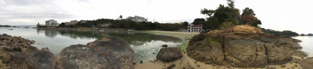![]() 人生は旅だ ![]() <趣味> 先日調整した7メガヘルツのアンテナのテストを兼ねて千厳山の駐車場にてCQを出している局を何度か呼んだら気づいてくれた。相手からRS 52,私から59を送った。出力10Wのホイップの限界だろうか。 <魚釣り> 念のために竿を準備した。予報では雨だから釣る機会あるかなと思いながらも途中で餌を買って準備万端で二号橋を渡ったが引き潮だったのでそこは諦めた。最終的には宿の下の岩場で、餌を針に付けてホイと投げ込む。引き上げようとするといつものシナリオ通りに地球を釣って終了。あっという間に針など仕掛け一式を失って、トボトボと身ぐるみ宿に引き上げた。 (下のパノラマス写真の中心付近で魚釣りした)浜辺に砂のある建物が今回泊まった宿。食堂に建設会社からの平成3年寄贈の幕があったので、今年で25年目だろうか。 |
