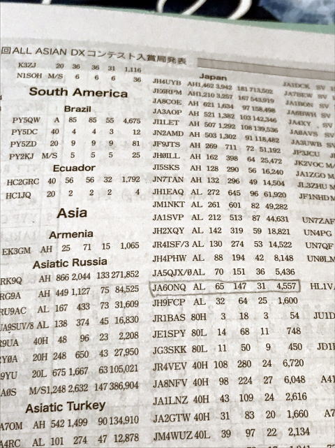| ALL ASIAN DX コンテストの結果がJARLニュース春号27pにあった。まったく知らずにうっかり紙収集日に出すところになんとなく捨てると後悔しそうな予感がして表面にあったのでビニール紐を緩めて取り出して眺めてみたらあらまあ最下位近くにコールがあった。参加したってだけなのだが・・2018年9月開催電話部門の結果 |