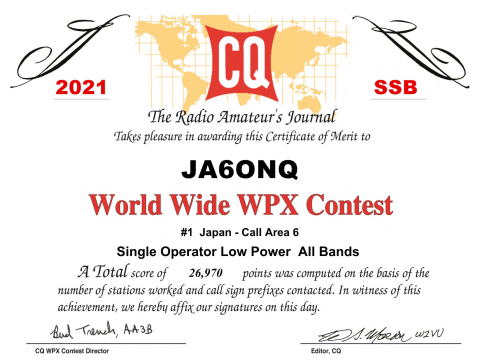 2018 CQWW DX CW *JA6の13局中10位 *JA6ONQ " 2,604 42 19 23 2018 2018 CQWW DX SSB *JA6の4局中の2位 *JA6ONQ " 23,232 122 32 56 2017 CQWW DX SSB *JA6の4局中の2位 *JA6ONQ " 11,918 88 18 41 Band (A = all), Final Score, Number of QSOs, Zones, and Countries. の順 但し参加は「All band Low」の分野 |