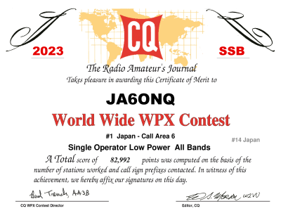 | 2023年3月のWPXコンテスト電話部門結果 | 208件の交信で九州で1番・・って、ホントかなあ。めまい回復中の体調と あのアンテナでよく出来たものだ・・ CQ WPX Contest: 2023 SSB Score: 82,992 points Category: Single Operator Low Power All Bands