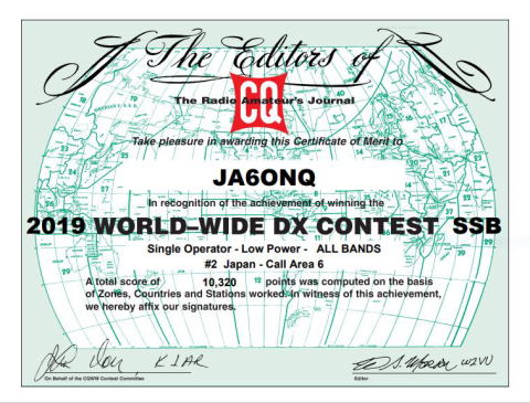 | 2020年 WW-SSB コンテストで九州で1番 2019年 WW-SSB コンテストで九州2番 |