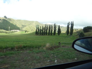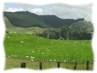 | オークランド空港→ マンゲア いたるところに羊や牛がのんびり草を食んでた。 途上で蜂蜜を試食して購入・・お土産はあまり 買えなかった。 |