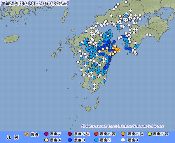 | 2017/06/21(水) | <地震>今夜から明け方もチョット警戒が必要かな。 21日17時13分頃 千葉県東方沖 M3.6 震度2 21日14時59分頃 茨城県北部 M3.3 震度1 21日13時06分頃 新潟県上越地方 M2.5 震度1 21日09時52分頃 福島県沖 M4.1 震度1 21日07時56分頃 沖縄本島近海 M3.1 震度1 21日07時31分頃 豊後水道 M3.5 震度1 21日05時05分頃 安芸灘 M3.2 震度1 20日23時27分頃 豊後水道 M5.0 震度5強 |