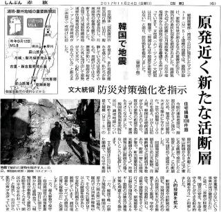 | 2017/11/29(水) | 今日は午前10時から近所の〇〇地域包括の運営協議会へ、施設代表とか老人会や民生委員、市の担当者などの参加者の中一人住民代表として参加。PPKCという話しが出て・・ピンピンコロリもここまでやってきたか・・これも終末模範という政策になっているのかと思ってたら”ピンピン暮らす”だって・・LS(リベレーティングストラクチャー:経験共有金魚鉢)って4人の関係者の意図ある経験雑談を聞いて、感想を述べよとマイクが順番に回ってきた。住民代表として何か発言しなくてはと思っていた(思うのはだって自由だもん)が口から出る言葉は頓珍漢な言葉ばかり・ああ皆さんは分からなかっただろうなあ”ごめんなさい”頭の中で今日も反省するXipociだった。 ・・昨日もそんな会話があったなあ。ミルク牧場で搾乳体験してこられた親子という話しで、うっかり「授乳体験をしてきた」と言ったら、「それ違うでしょう」と元同僚が大笑い。・・牛の下に潜って口をあんぐり開けてるシーンを想像して私も吹き出した。うまく言葉が紡げなくなって63年・・Xipociに成長はまだ期待してよいのだろうか。・・ そのうちに会議終了。さっさと出されたお茶とお菓子をバックに詰めて会議室を後にした。一番先に出て車で帰りつく。珈琲豆が届いていて、ご主人様は駐車場を耕して畑にすると小雨の中頑張っていた。・・昼からはまた仕事だ。 北朝鮮がいつものようにミサイル1発・・もう慣れっこになった様子で大騒ぎもなく。もうどうでもよいか・・しかしこんなミサイルが原発に落っこちたらもう大変だ。運用中の場合も影響はあるだろうが、それより使用済み核燃料の破壊がその何十倍も危険だという話もある。所狭しと保存されている使用済み燃料だが、本来規格より密にして保存してあり、人工的破壊によって、その距離が保てなくなると再臨界などの可能性もあり、中性子で周囲が放射化されることも・・そうなるともう誰も手がつけられなくなる。アンタッチャブルな広大な使い用のない土地が残される、・・右の新聞記事は原発近くの活断層を示した図がある。近くには12基の原発が並び、これらが破壊されると西日本の2000万人が永久避難となるらしい記事を読んだことがある。九州から大阪まで人が住めなくなるというのだ。そのうち言論統制下では、こんな記事もアンタッチャブルになるかもしれないなあ。<新聞記事をクリックすると拡大して読める> <地震>今日はまだ1回、昨日は熊本でも1回あったようだった。 本日 05時06分頃 岐阜県飛騨地方 M2.8 震度1 昨日 23時02分頃 熊本県熊本地方 M2.5 震度1 他7件あり東京も揺れていた。 |