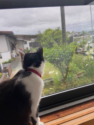 逮捕されたハナは満足したのか、今日はもう外に出ようとはしなかった。暑さを避けて風通し良い場所でごろんごろんして過ごしている。PM6過ぎに144/430Mhzのトランシーバー持参で、たんぼ道散策。川辺の道には今日も真っ黒のニョロニョロも散歩中だった。帰り着いてから冷蔵庫から冷たく冷やした缶ビールを、コップに入れて2階の西向きの窓辺に腰掛けて、微風を受けながら沈む太 陽を眺めているPM7.。冬は普賢岳の左に沈むが、夏はずっと右に沈む、また一日の幕が閉じる。あと何度の日暮れを見ることだろう。猫もまねして夕日を眺めている。 |