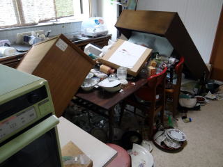 大きな石垣の岩がゴロゴロ転がって、道路も亀裂が入っていた。湧き水が豊富な集落なので、水の音がやがて耳に入ってきた。 普段なら心地よい音なのに、震災の真っ只中では、空を飛ぶヘリコプターと同じ雑音にしか聞こえない。すでに興味は我が山小屋に心が占められていた。・・大きく損傷した家、それほど目立たない家もあって、家に近づくにつれ、我が山小屋の様子が知りたく私は、より足早になった。妻は春の花に興味を奪われ、ずっと後ろから追いかけてついてくる。 見慣れた民宿の上をあがると隣のHさんの家、大丈夫そうだ。その隣の白壁の蔵の屋根が少しやられていた。 やがて山小屋の赤い屋根が見えてきて真上屋根頂上の瓦が連続して落ちている。ドキドキして2階玄関に入ると 冷蔵庫を除くとほとんどに棚が倒れていた。玄関前の棚も含めて全て倒れていた。食堂を開けると倒れた棚からグラスの破片や、茶碗の破片が散乱している。 妻は1階の展示物が心配で降りたが、私は屋根が気になり、思い切って屋根裏から瓦の上にそっと足をのせて、屋根の上に上がってみた。勿論グラリ用に命綱をアンテナ固定用の針金に通して片手に持ち、修理を依頼するためにとi-phoneのカメラ機能で全景を撮影。 今グラリと来たら一貫の終わり。一瞬一瞬が「常識と非常識」の闘いだ。妻へ報告すると「こんな時、まさか屋根に登るなんて」と非難された。 幸い展示場の作品に傷はない。あれほどの揺れでも預かっていた手作りの作品類も大丈夫だった。私が外に出て落ちた瓦を集めていると、牛の世話にきていたYの婆ちゃんが近寄ってきて深刻な話を伝えた。 既にこの地域全部が避難してるらしい。訳を聴くと俵山の方向に二本の亀裂があって、自衛隊のヘリコプターが時々亀裂を確認しに来ているという。もし大きな揺れが来たら集落が飲み込まれるかもしれない、だから集落が危ないので避難したらしい。 婆ちゃんの家の牛小屋も半壊状態で牛を小屋から出して、人気のなくなった集落で一人牛に水と餌を与えに来ていると言う、終わったら避難所に帰るようだ。・・私の頭はパニックになった。 もしかしたら部落ごと土に飲み込まれること・・阿蘇大橋が一瞬に消えたあのすごい土砂の流れが我が山小屋を飲み込む様を想像してクラクラした。想像は深い怯えになった。・・それまでのんびり後片付けしていた妻も手を止めて、帰宅モードに事態は急転。 最後に2階に戻り、金曜日に泊まる筈だった寝室を開けた・・・そうしたら大きな重いタンスが部屋いっばいに横たわっていた!こりゃ即死だったな。猫に命を救われたようだ。普段は金曜から日曜まで山暮らしだったのに、前日の地震に留守番の猫が怖がっていたので妻が猫が心配というので、(私は夜が明けて様子見に行こうと思っていたのだが)市内に帰ってきて寝息を立てて居た頃不意に大きな本震に襲われた。もしあのまま山に居たらと思うと血の気が引いた。 「危険だから、はよここから離れたほうがよかよ」というYさんの声が耳にささり大慌てで帰り支度を急いだ。徒歩なので荷物はそのまま、店用に買っていた冷蔵庫の野菜類をリュックにつめただけで、外に出て初めて自動車の鍵がポケット Xipoci 亀裂が拡大するのか、・・・地域の方は戻れるのか 今は善良な方が住むこの地域が土砂に飲み込まれないことを祈るだけ。24日のコンサートは地域にみんなが戻れるまで延期ということにした。しばらくは見守るだけしかない。 |