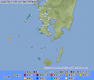 | 5月10日(火) | 今朝から芦北沖で3回揺れ水俣では震度3もあった様子、そんな訳で私はこの日車で南下することに躊躇していた。それでも娘の検診はちゃんと受けさせなければという思いもあって予定通りに出発した。<結果論だが偶然にも8時28分~13時41分までの間は揺れなしとは不思議。>その間に八代を往復した。午前9時30分出発し、途中小川のイオンモールで小便休憩(ここは一部食品館付近は開いていたが蔦屋など専門店は閉店している模様。周囲はブルーシート屋根多い)して娘の定期診察先の八代の産婦人科まで送った。そのあと2歳の孫を連れて八代ユメタウンへ。全く地震なんて関係ないというような場所で、普段通りの賑やかさで同じ被災地なのかと思うほどだ。もし揺れたら孫を守れるだろうかと大きな物の下敷きにならない場所ばかり選んで歩く。おもちゃ売り場を中心にキッズプレイルームで自動車遊びなどして待ち時間2時間ほどで診察が終わり、帰りは産科の近くの道路で娘を拾う。途上の竜北の道の駅に寄って昼飯を買う。その後熊本まで3号線をスイスイと戻り、買ってきた弁当を食べて、のんびりしている時に13時41分の揺れ(宇城市不知火の震度3=姉がいる場所)あった。それでまだ”揺れの非常事態中であること”を意識してしまう。 既に朝10時過ぎには宇城市に山沿いの地域で避難勧告が出され大雨が県下一円だとラジオは脅していた。夕方には雨は小降りになっており、土砂崩れなど起こらないことを願う。と書いてる16:12JSTも揺れがきた。西区で震度2だった。 |