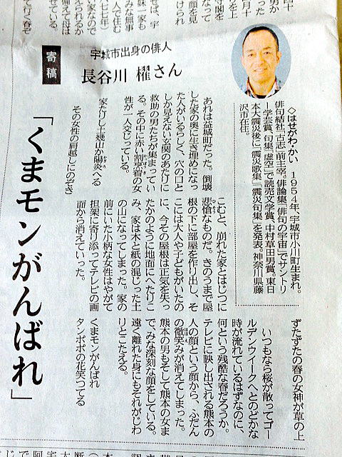 ![]() 本文は長谷川櫂のオフィシャルサイトにあります。 i-phone で撮影するも 全体がはいらない。(手にもった新聞の風景と思ってください)こんな風な記事(ほんとは読めるのですが上が切れているし著作権もあってわざと読めなくしてます)・・でも励ましはみんなに読んでほしくて 4/20熊日 家にあれば読んでください。 |