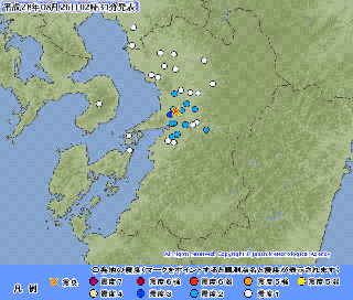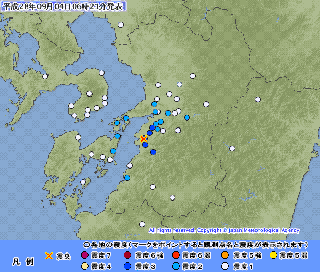 | 2016/9/4(日) | 朝から台風12号の影響で小雨時々曇り。孫は散歩に出ると言ってきかないが、久しぶりに爺さんは安息日。台風の遅すぎる足取りにイライラしている。その昔似たような台風が来たこともあったが、なかなか通過せず、ちょうど台風の中心になったとき東京まで飛行機で出かけたがその時も空の便に欠航もなく、スイスイと飛んで行ったときがある。8月か9月の社会 福祉士会の独立型研修で青年会館に行ったときだったかもしれない。ちょうどこんな具合でのろまな台風だった。我が家の猫の足がもっと速そうな気がする。雨さえ小降りのままであればそれほど心配はいらない。このHPを書いてるときゴーという音がした揺れたかな。17時50分・・・M2.4 西区で震度1という結果だ。地震が収まるのはいつのことだろう。 <地震> 本日は18時までに早朝の6:17八代中心に震度3、それと先ほどの揺れを含めて2つの震度1があった。風は大したことないが大雨が降ると危ないなあ。それから阿蘇で震度1。 図は八代の今朝の揺れ:八代市内直下が震源だ。 |