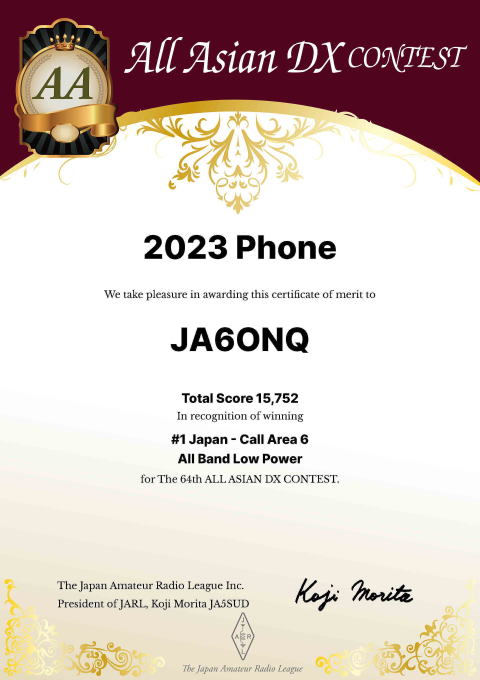 | 2023年9月の AllAsiaDXcontest の結果 (2024年4月22日メールで受け取り) *今年から郵送でなくPDFで処理されて他のコンテストと同じ扱いになってしまった。まあどっちでもいいけど経費節減だけど、打ち出すプリンターのインクは自分持ちになったということだ。 |