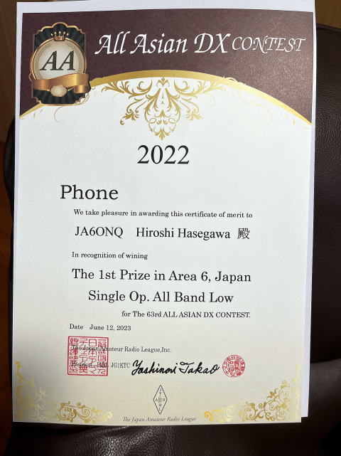| 2021年9月のALL Asian DX contest の賞状が6月9日に届いた。最近はアクティビティが低くなってしまったので、こんなものがあると目を覚ましてしまうではないか・・感純なハムの生活に時々喝を入れてくれる。 |