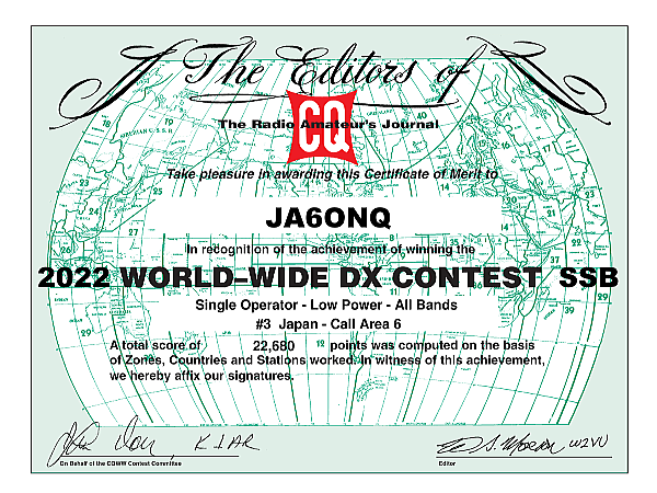2018 CQWW DX CW *JA6の13局中10位 *JA6ONQ " 2,604 42 19 23 2018 2018 CQWW DX SSB *JA6の4局中の2位 *JA6ONQ " 23,232 122 32 56 2017 CQWW DX SSB *JA6の4局中の2位 *JA6ONQ " 11,918 88 18 41 Band (A = all), Final Score, Number of QSOs, Zones, and Countries. の順 但し参加は「All band Low」の分野 |