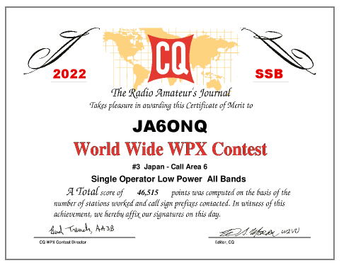 WPX2022 SSBの結果 (WPXよりのお知らせ9月参照) Contest: 2022 CQ WPX SSB CONTEST Call: JA6ONQ Operators: Category: Single Op All Band Low Power |