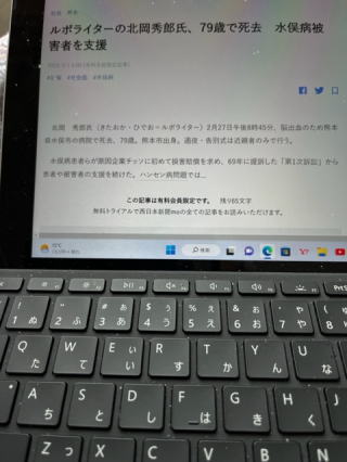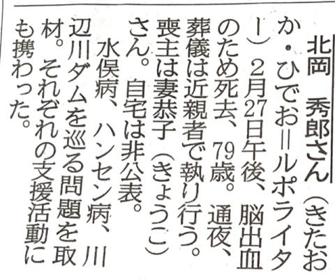 8時間ほど前に西日本新聞web版に北岡さんの訃報が載っていた。水俣病支援やハンセン病支援のことがあるが記事は有料で先が読めない・・北岡さんの79歳の生涯で最近の功績としての著作物を少しだけあげてみよう。(AMAZONの本棚から)『人間回復:ハンセン病を生きる 』単行本 –2021/8/23志村 康 (著), 北岡 秀郎 (編集) ノーモア・ミナマタ 解決版 北岡 秀郎, 水俣病不知火患者会他 | 2011/9/1 たいせつな探しもの―くすのきクリニックの17年 北岡 秀郎, くすのきクリニック記念誌編集委員会他 | 2010/1/1 見捨てられた水俣病患者たち 救済を待つ人びと 水俣病不知火患者会、 北岡 秀郎 | 2015/6/20 終わらない水俣病:すべての被害者の救済を目指して 北岡 秀郎、 水俣病不知火患者会 | 2022/11/21 原爆症認定訴訟―熊本のヒバクシャたち 牟田 喜雄, 北岡 秀郎他 | 2006/7/1 命あるかぎり―水俣の証言 橋口 三郎、 北岡 秀郎 | 1987/7/1 ノーモア・ミナマタ 北岡 秀郎, 水俣病不知火患者会他 | 2007/3/1 その他 川辺川問題や熊本AALAで取り組んで来た冊子の中に北岡さんの記述が沢山ある。 |