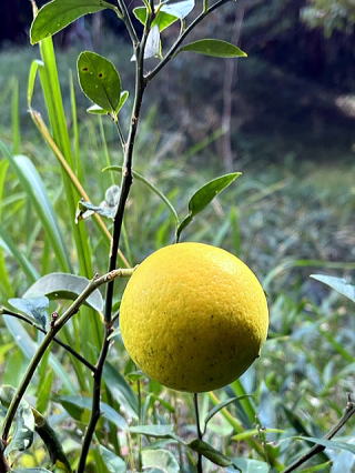 | 2022/11/04金 | 檸檬の実が一個、今年は収穫できそうだ。唐芋は猪に喰われてしまったので諦めた。 檸檬の方は毎年楽しみに実を待っていたもう一本の先輩の木には全然実を結ばず、新たに小さな木を買って植えた。購入の時から実は二つあって、すぐにその一個は黄落ちてしまった。残る一個の成長が楽しみだった。 黄色くなった檸檬を搾って魚料理にかけるのもうよいし、紅茶に輪切りで浮かべるのもよい。何しろ、無農薬だから。身体にもよい。 秋風に 黄色く揺れる 檸檬かな なんちゃって。最近、俳句にフォト575に 肥後狂句にと575の区切りが私の中に身についてきた。困ったことだ。 太陽の光を受けた檸檬の影をみていたら月の満ち欠けに見えてくる。夕方の 檸檬のかたち 三日月に |