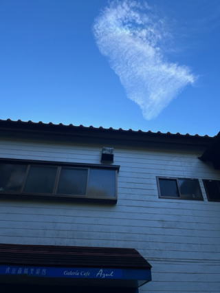 | 2022/11/06日 | 紙袋みたいな奇妙な雲が浮かんでいた。全く偶然熊本市内でも同じ時刻に同じ形の雲にカメラを向けていた人があった。FACEBOOKに投稿されていたので、私のもコメントに送っておいた。奇妙な雲への奇妙な興味の一致である。最近地震雲みたいな雲がないかという注意しながらの観察ががおろそかになってきた。でも不気味な雲は時々見かける。カメラを直ぐにむけるが、今日のような漫画の世界の主人公のような雲も目珍しい。確かこんな形の妖怪がいたような。佐渡島の衾(妖怪)?・・いや違う。何かでみた覚えがあるが、名前まで知らない。 |