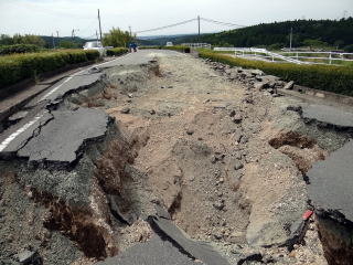 ![]() 昨年の震災時の写真 西原村風当付近。この先の橋はまだまだ修理中。 |