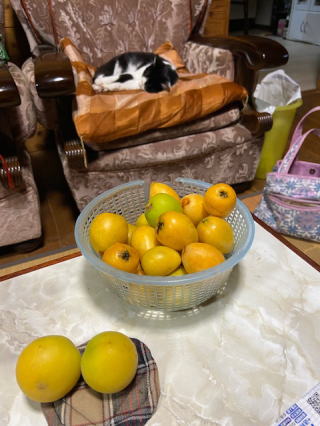 昨日の山小屋は、寒くてコタツが欲しかった。肌寒さの中でやっと待望の黄色くなった枇杷は手に取れる範囲をもいだ。他所の枇杷と比べて酸っぱくてあまりおいしくないが、枇杷らしい味がする。今日は下界での生活で33度と暑くてもう真夏だ。ご主人様が外で庭仕事をしているところへ、愛猫ハナが出てきたという声を聞いて確認すると、ハナは外で遊んでいた。締め切った部屋からどうやって逃げ出せたのか不思議だが、逃げ足が速い。知人のPC修理依頼でそのまま出かけたので心配だったが、捕まえようとすると逃げるばかり。それで、知らんふりして作業を続けていたご主人様の方に自分から近づいてところを逮捕したらしい。 |