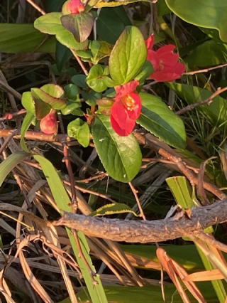| 2021/11/01月 | 今日は午後は小川の草刈りに行った。何しろもう枯れ草がすぐだろうから今年最後の草刈り爺さんとなった。少し寒いかなと厚着をして行ったら気温は26度に上がって相変わらず汗をかきながらの草刈りだ、小川へ向かうとき、松橋では、昔の職場の同僚の方が老人会の仕事だろうか10名ほどの先頭に居た。こんちわと手を挙げると。ドアの向こうから何しよっとやと相変わらずの口調・・で帰りに寄ってくれんかというので・・この草刈りを時半に終え5時過ぎに帰り道に訪問。すると最近購入したPC用カメラ(ZOOMに使用)の調整をして呉れと言われる。調整も何も、カメラの切り替え設定するだけで終わり。あっけないお手伝いだった。その帰り道の暗いこと。5時40分はもう真っ暗だ。草刈り終えたあと庭に真っ赤な木瓜の花があるのに気づいた。 |