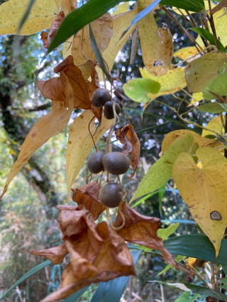 | 2021/11/07日 | 静かな三日間だった。昨夜は職場のOB会のオンライン打ち合わせ。昼のランチ会か夜の忘年会かということで調整したが、皆さん忙しくて空いて居る日がなかなか合わない。老人会に、仕事現役に、様々な会議もあって現在の60代70代80代は忙しい。注文の少なすぎるカフェの住民は日向ぼっこしながらの散歩ばかり。折角晴れたのだから森の中を歩いてきた。もう少し早くにむかごに気づいたらそりゃあいっぱいのむかごご飯食べられたのに。既にその茎にはムカゴは落ちて葉っぱは紅葉(黄葉)している。 |